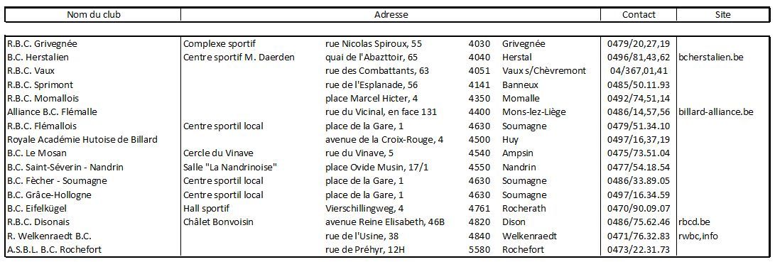 Etant moi-même un joueur de billard à carambole de la région Liége-Luxembourg, je me limite ici à ce type de billard à défaut de connaître les autres. Si les dirigeants des autres organisations (bouchon, américain, pool, snooker) me font parvenir une liste de leurs clubs, c'est avec plaisir que je compléterai cette page.