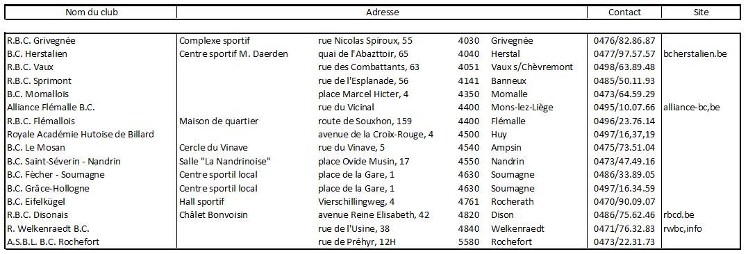 Etant moi-même un joueur de billard à carambole de la région Liége-Luxembourg, je me limite ici à ce type de billard à défaut de connaître les autres. Si les dirigeants des autres organisations (bouchon, américain, pool, snooker) me font parvenir une liste de leurs clubs, c'est avec plaisir que je compléterai cette page.